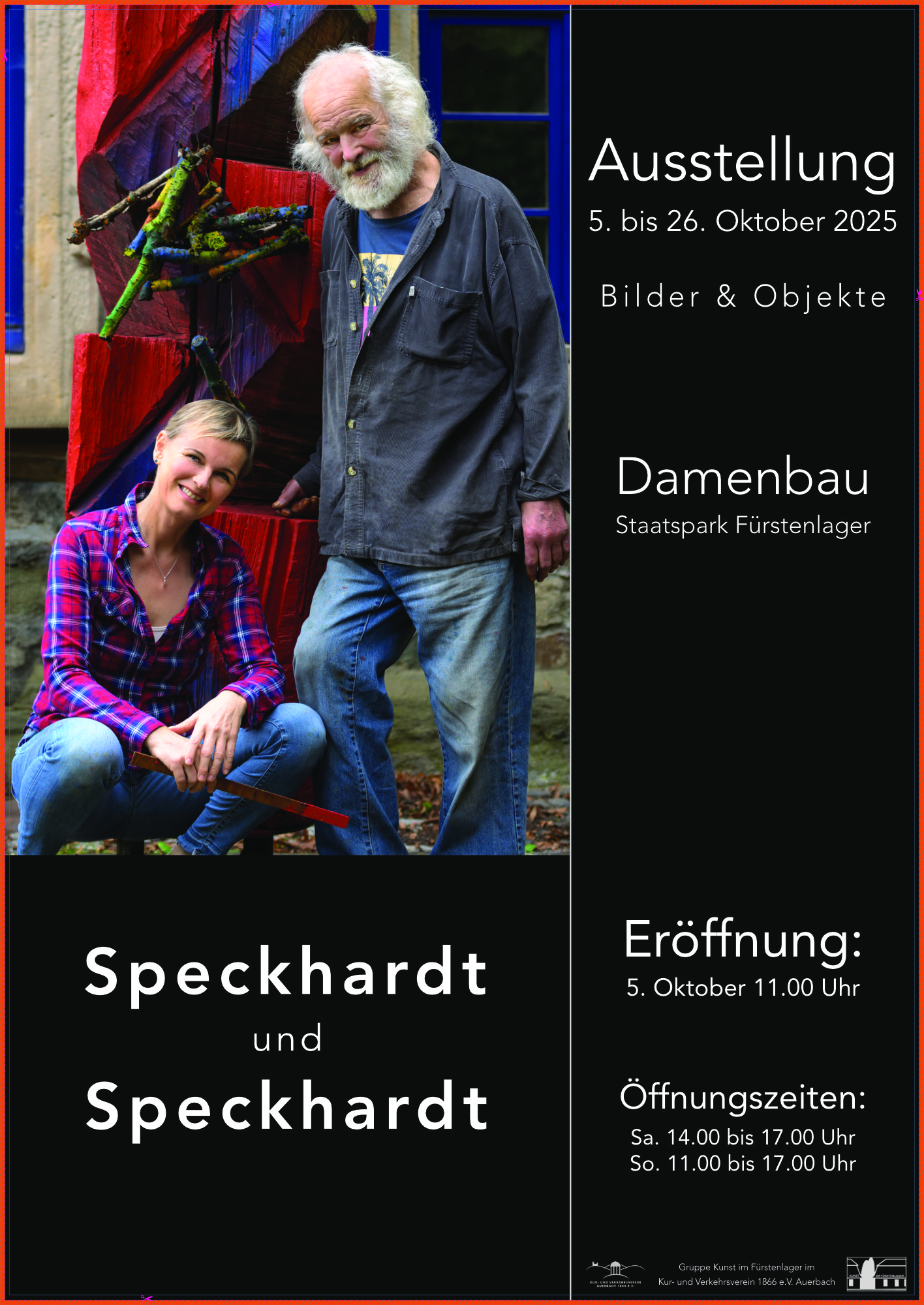 “SPECKHARDT UND SPECKHARDT“, so der Titel der Gemeinschaftsausstellung von Siegfried Speckhardt und seiner Tochter Nathalie. Vom 5. bis 26. Oktober 2025 zeigt die Gruppe Kunst im Fürstenlager des Kur-und Verkehrsverein die farblich kraftvollen Arbeiten der beiden Künstler , vorrangig auf Leinwand und Metall, in dem historischen Gebäude Damenbau des Fürstenlagers. Siegfried Speckhardt, gelernter Maler, Grafiker und Plastiker war u.a. Schüler bei Dr. Horst Scharschuch an der freien Akademie Mannheim.